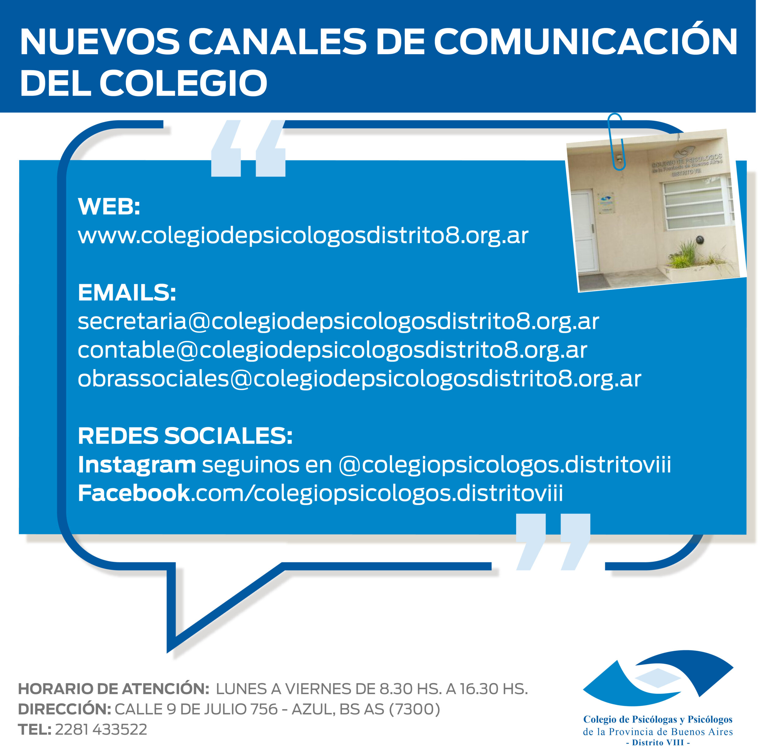 Desde el Colegio de Psicólogos, Distrito VIII, con sede en la ciudad de Azul les informamos cuales son nuestros nuevos canales de comunicación: WEB: www.colegiodepsicologosdistrito8.org.ar EMAILS: secretaria@colegiodepsicologosdistrito8.org.ar contable@colegiodepsicologosdistrito8.org.ar obrassociales@colegiodepsicologosdistrito8.org.ar SEGUINOS EN REDES SOCIALES: Instagram seguinos en @colegiopsicologos.distritoviii LINK DIRECTO: https://instagram.com/colegiopsicologos.distritoviii?igshid=YmMyMTA2M2Y= Facebook.com/colegiopsicologos.distritoviii LINK DIRECTO: https://www.facebook.com/colegiopsicologos.distritoVIII/ También les recordamos: HORARIO DE ATENCIÓN: LUNES A VIERNES DE 8.30 HS. A...
