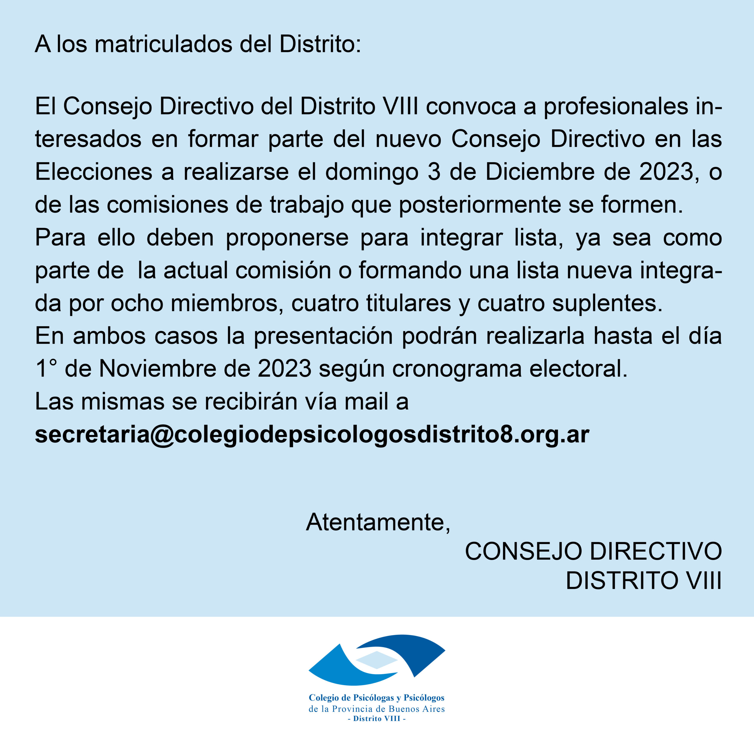 A los matriculados del Distrito: El Consejo Directivo del Distrito VIII convoca a profesionales interesados en formar parte del nuevo Consejo Directivo en las Elecciones a realizarse el domingo 3 de Diciembre de 2023, o de las comisiones de trabajo que posteriormente se formen. Para ello deben...