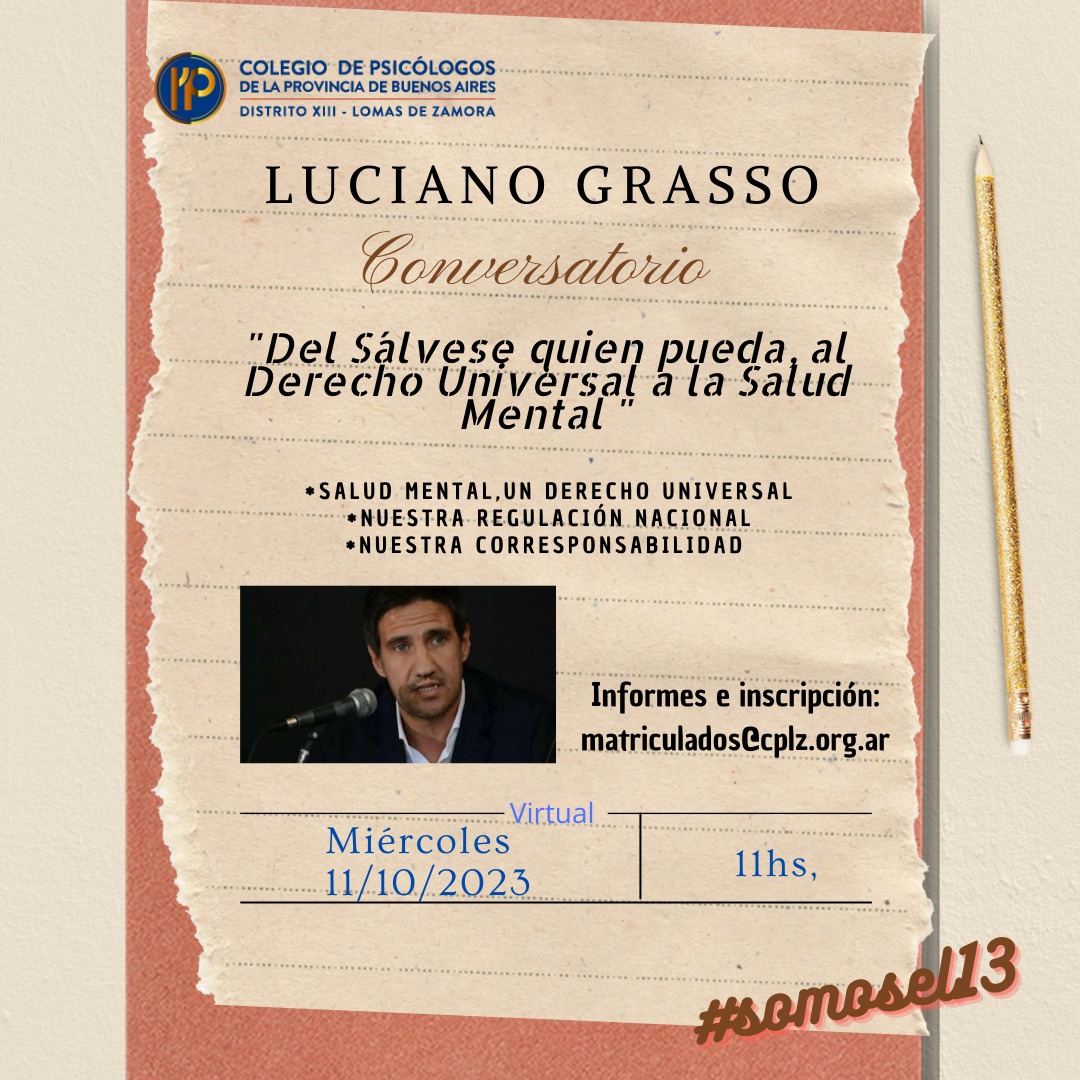 ☑Invitamos a participar del Conversatorio de Luciano Grasso "Del sálvese quien pueda al Derecho Universal de la Salud Mental" 👉Modalidad: Virtual 📎Miércoles 11/10 a las 11 horas 📝Invita y Organiza: Colegio de Psicólogos Distrito VIII ...