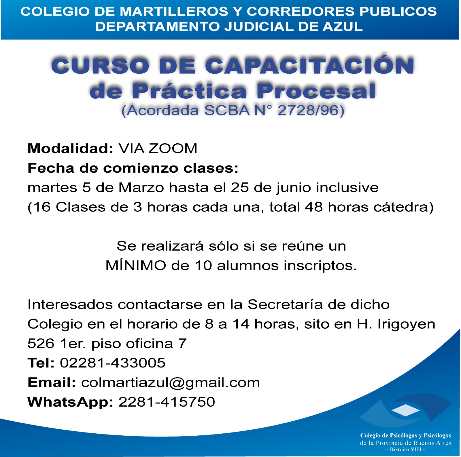 EL COLEGIO DE MARTILLEROS Y CORREDORES PUBLICOS DEL DEPARTAMENTO JUDICIAL DE AZUL CURSO DE CAPACITACION de Práctica Procesal (Acordada SCBA N° 2728/96) A realizarse VIA ZOOM Fecha de comienzo clases: martes 5 de Marzo hasta el 25 de junio inclusive. (16 Clases de 3 horas cada una, total 48...