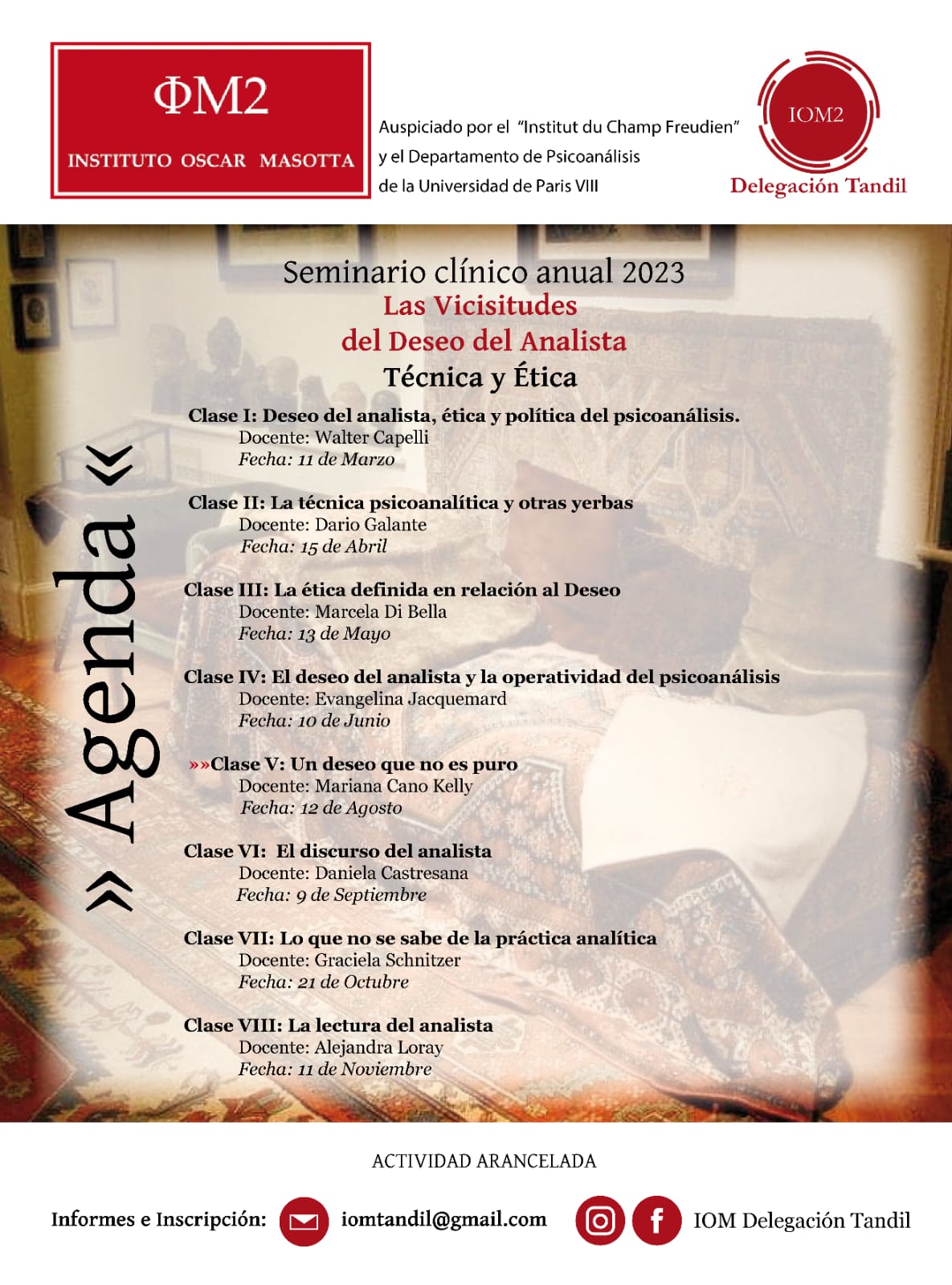 Seminario Clínico Anual 2023 0 Comments 0 Likes Seminario Clínico Anual 2023 Las vicisitudes del Deseo del Analista 12 de agosto / 9.30 Hs. Centro Cultural El Taller / Alem 832 / Tandil